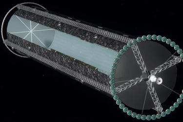 Hohmann Transfer Cylinder: Imagine a vast, 1.8 km diameter spinning cylinder, spun at one revolution per minute for Earth-like gravity without queasiness. The Hohmann Transfer Cylinder is a floating city, built on the moon using Phase Three’s robotic factories. Its walls, packed with ten meters of water-ice shielding, block cosmic rays, ensuring passenger safety during the six-month journey to Mars. Wide decks house hydroponics, gyms, and communal spaces, making the trip feel like a cruise, not a commute. Launched at a gentle 800 miles per hour from the Lunar Launch Ring, the cylinder enters a stable Hohmann transfer orbit—a two-year ellipse syncing with Earth and Mars every 26 months. Small Starship shuttles ferry passengers from Earth to the cylinder, docking in low lunar orbit. At Mars, compact landers detach, aerobraking and parachuting to the surface. The cylinder never stops, coasting perpetually with minimal fuel for station-keeping. It’s the ultimate human ferry: safe, spacious, and sustainable, carrying thousands to Mars with room to stretch and zero radiation worries.
